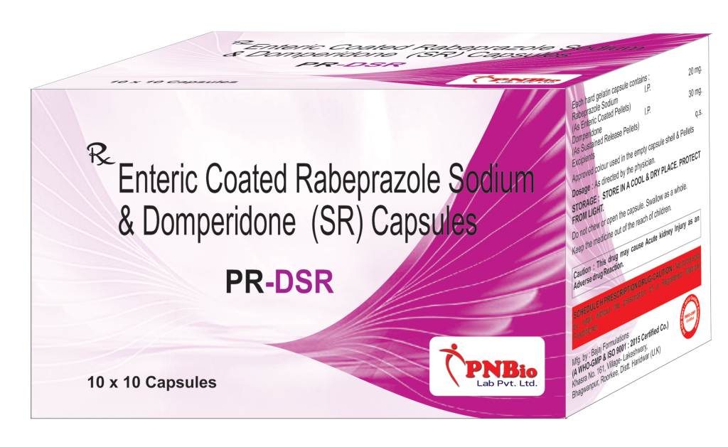 General Information: PR DSR Capsule Contains : Domperidone (30mg)+ Rabeprazole (20mg) Manufacturer: PNBio Lab Pvt Ltd Storage : Store below